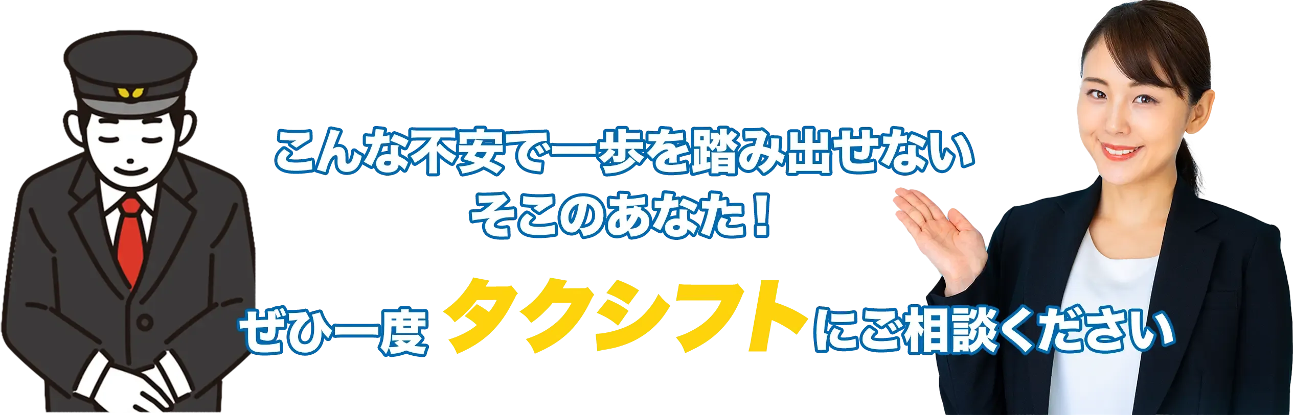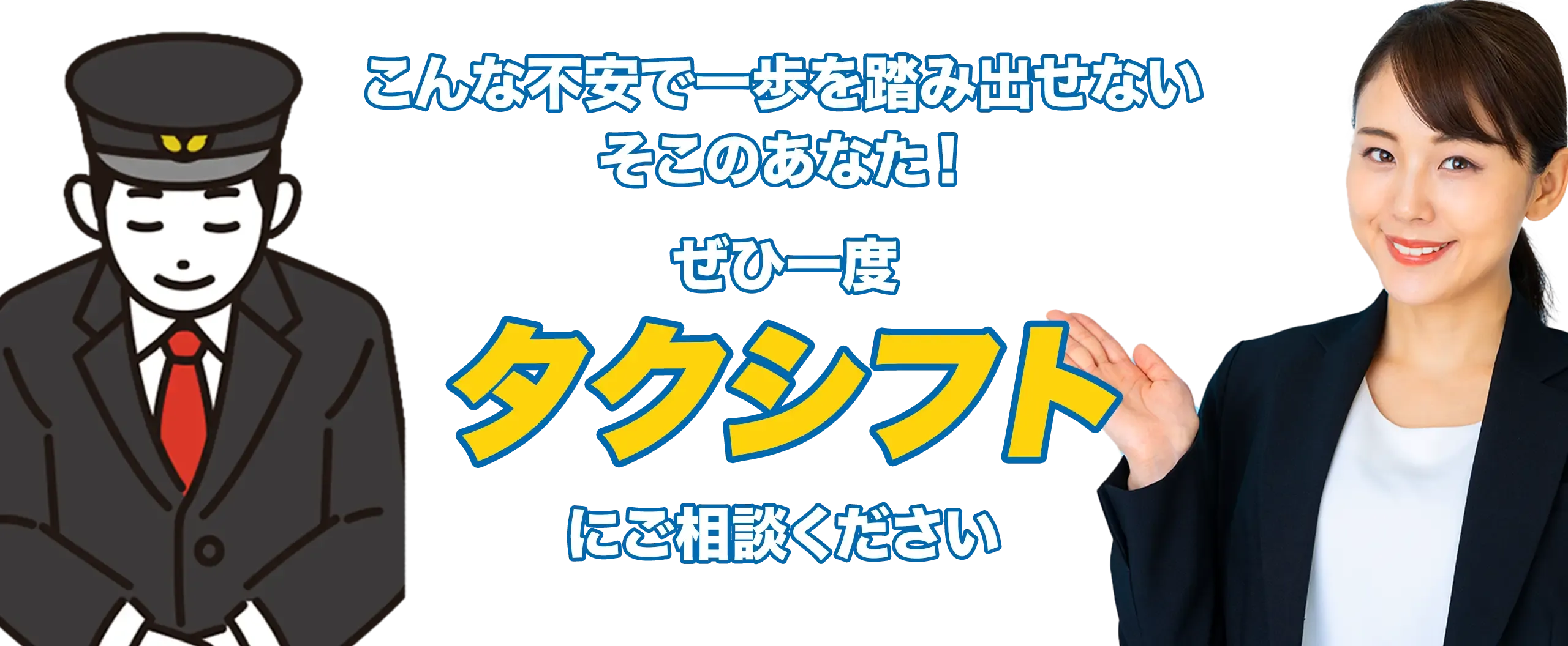 タクシフトではタクシードライバーへの転職相談はもちろん、タクシー会社のご紹介や入社後のアフターサポートまで、全て無料で行います!まずは相談ベースでOK!安心して、お気軽にご相談ください!